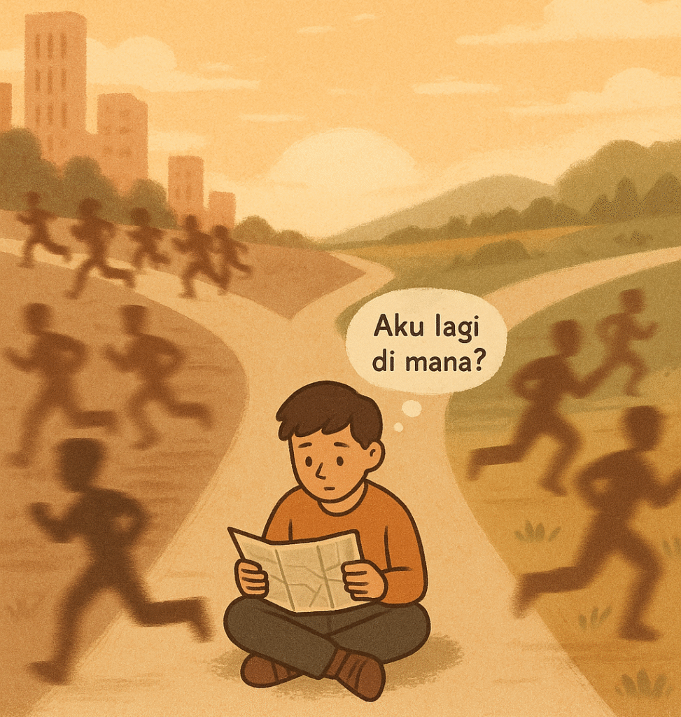 Kita pun sering begitu dalam hidup. Ngebut. Ngebandingin diri. Ngerasa harusnya udah sejauh orang lain. Padahal, kita sendiri belum benar-benar tahu posisi kita sekarang.