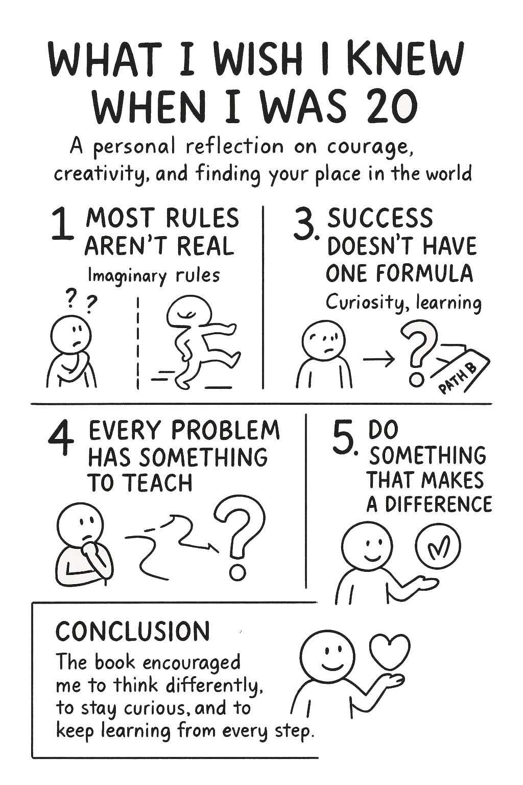 Reading What I Wish I Knew When I Was 20 reminded me that life is not about waiting for the perfect moment but about making something meaningful out of what we have right now. The book encouraged me to think differently, to stay curious, and to keep learning from every step. It is a gentle reminder that courage, kindness, and creativity can take us further than we imagine when we choose to keep growing every day.